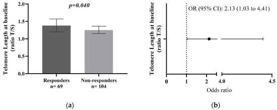 Responders exhibited a higher baseline TL in comparison with Non-Responders (1.38; 95% CI, 1.57 to 1.20 compared with 1.25; 95% CI, 1.36 to 1.15; p = 0.040) (Figure 2a). We performed a logistic regression analysis to determine the probability of type 2 diabetes remission based on baseline TL. As described in Figure 2b, we found that a higher TL at baseline was associated with a higher probability of type 2 diabetes remission (OR 2.13; 95% CI, 1.03 to 4.41).