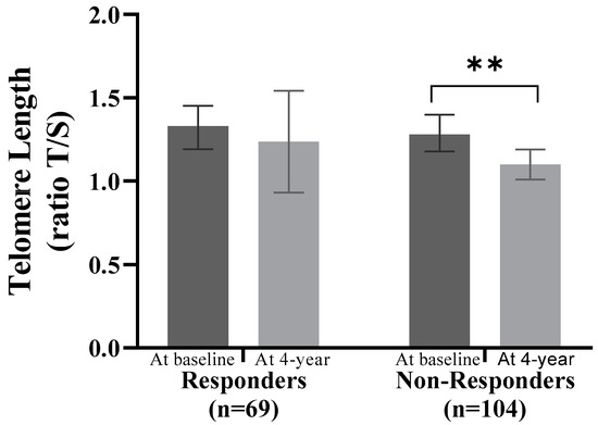 3.3. Accelerated Telomere Shortening in the Non-Responders Group