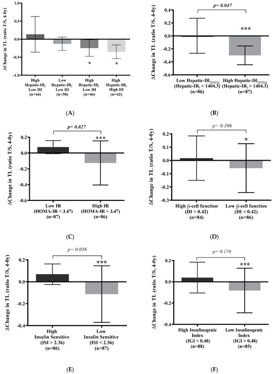 We evaluated Δchanges in TL (post-intervention minus baseline) according to the indexes of insulin resistance and beta-cell functionality (Figure 4) and observed that telomere shortening was significantly pronounced in type 2 diabetes patients with high Hepatic-IRfasting and high DI (−0.35; 95% CI, −0.54 to −0.16; p < 0.001) and low DI (−0.25; 95% CI, −0.47 to −0.01; p = 0.037) (Figure 4A). To assess the associations between insulin resistance, beta-cell functionality, and telomere shortening, we evaluated the Δchanges in TL (post-intervention minus baseline), looking at each of the indexes separately. Patients who presented high Hepatic-IRfasting (Figure 4B), high HOMA-IR (Figure 4C), low DI (Figure 4D), low ISI (Figure 4E), and low IGI (Figure 4F) exhibited significant telomere shortening (p < 0.05). Specifically, patients with high Hepatic-IRfasting (−0.15; 95% CI, −0.30 to −0.01; p = 0.047) and high HOMA-IR (−0.14; 95% CI, −0.30 to 0.01; p = 0.027) showed faster telomere shortening in comparison with patients with low values of both indexes.
