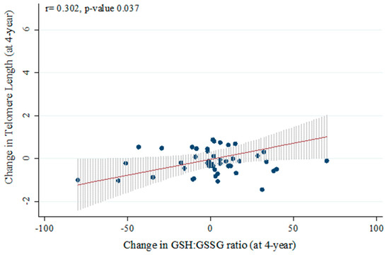 To evaluate the association between telomere shortening and oxidative stress, we carried out a correlation with the ratio of reduced glutathione (GSH) and oxidized glutathione (GSSH). This correlation was evaluated in a subpopulation of the study, in which all data for GSH/GSSH and TL at baseline and year 4 of the intervention were available (n = 48). We found that changes in TL positively correlated with changes in the GSH:GSSG ratio (r = 0.302, p = 0.037. Figure 5).