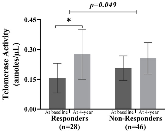 On the other hand, we also observed an increase in telomerase activity in Responders in comparison with Non-Responders. Under certain conditions, it is theoretically possible that telomerase activity, in normal stem cells, may slow down the rate of telomere shortening. In patients with type 2 diabetes, poor glycemic control is associated with decreased levels and telomerase activity, which increases susceptibility to cardiovascular disease [40,41]. Over the last few years, a significant increase in telomerase activity has been reported after nutritional interventions (e.g., n-3, vitamin D, or Q10 supplementation), which suggests the protective or detrimental effect of the diet on telomere maintenance [42].