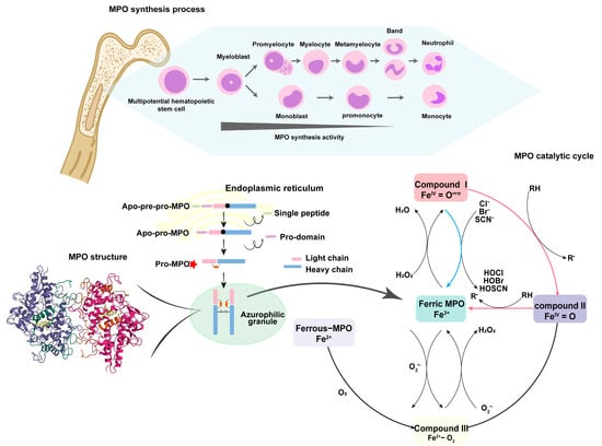 The generation, structure, and catalytic cycle of MPO. The upper part of Figure 1 shows the MPO synthetic process. MPO primarily exists in the azurophil granules of the myeloid series of hematopoietic cells. MPO synthesis occurs at the promyelocyte differentiation stages, and MPO synthesis activity gradually decreases during this process, disappearing in fully differentiated myeloid cells. The first step occurs in the ER, where primary translation production apo-pre-pro-MPO becomes apo-pro-MPO via the cotranslational glycosylation process. The next step, also in the ER, involves apo-pro-MPO combining with ER molecular chaperones and a heme group to turn into enzymatically active pro-MPO. The final step is pro-MPO leaving the ER and entering the azurophilic granule, where the two monomers combine to generate mature MPO. The left side of the picture demonstrates the structure of MPO, constructed in the Protein Data Bank (accession code 7Z53, https://www.rcsb.org/structure/7Z53, accessed on 12 September 2023). MPO (120–160 kDa) is a dimeric enzyme containing a light chain and a heavy chain in each monomer. There is a disulfide bridge connecting the two monomers, and each of them has a heme group that is attached to MPO with two ester bonds (connecting the light chain and the heavy chain) and a sulfonate bond. The right side of the picture illustrates the catalytic cycle of MPO, representing the main ways in which MPO exerts its innate immune function. Ferric MPO reacts with H2O2 to generate Compound I. Compound I can be backward-reacted into ferric MPO via two pathways, which are marked in blue and red in the figure. Among them, the blue path is called the halogenation cycle: Compound I is reduced by halide ions (or pseudohalide ions) to form ferric MPO and respective hypohalous acids. Also in the red path, Compound I can transform into native MPO via an intermediate, Compound II. Ferric MPO and Compound III can mutually transform by consuming or generating O2•−.