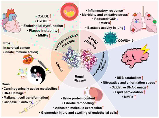 MPO’s various roles in cardiovascular diseases, lung diseases, neurodegenerative diseases, renal diseases, and cancer. (1) In cardiovascular diseases, MPO can oxidize LDL, impair HDL, activate MMPs, as well as increase endothelial dysfunction and plaque instability. (2) In lung diseases, MPO can increase inflammatory responses, morbidity, oxidative stress, and MMPs, while decreasing GSH and elastase activity in the lung. Additionally, MPO is involved in the COVID-19 inflammatory process and is associated with disease severity. (3) In neurodegenerative diseases, MPO can increase BBB catabolism, nitrosative and chlorination stress, and lipid peroxidation as well as activate MMPs and induce oxidative DNA damage. (4) In renal diseases, MPO can increase the urine protein content and adhesion molecule expression and induce glomerular injury and the swelling of endothelial cells. (5) Unlike in other diseases, MPO acts as a two-edged sword in the cancer pathological process. On the one hand, MPO can increase carcinogenically active metabolites, DNA damage, and malignant cell transformation, as well as reduce caspase-3 activity to protect cancer cells from apoptosis. On the other hand, MPO has pharmacologic effects on cervical cancer via its innate immune action.