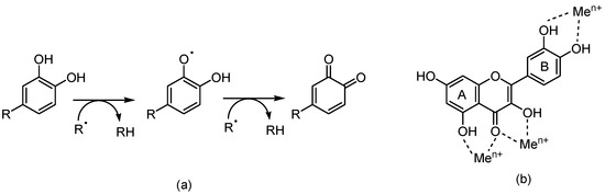 (a) Mechanism of free-radical (R) scavenging by the 3,4-catechol structure in the B ring of a flavonoid; (b) binding sites of trace metal ions (Men+) to a flavanol structure (e.g., quercetin).