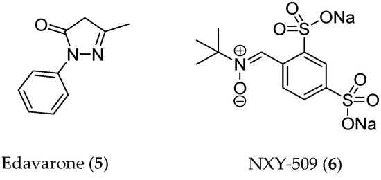 However, so far, neither bioactive polyphenols nor synthetic antioxidants have been approved for any indication. To the best of our knowledge, edaravone (Mitsubishi Tanabe Pharma Corporation), a synthetic pyrazolone derivative (5, Figure 3) acting as a free-radical scavenger, has recently been approved for stroke and amyotrophic lateral sclerosis [40], whereas the nitrone compound NXY-059 (6) failed to show clinical efficacy, though it had significant effects in the preclinical treatment of acute ischemic stroke [41].