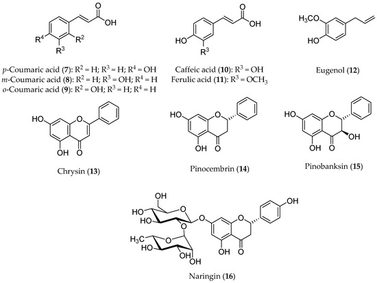 Honey contains a mixture of different active compounds (Figure 4), including coumaric acids (7–9), caffeic acid (10), ferulic acid (11), eugenol (12), and flavonoids, such as quercetin, apigenin, chrysin (13), pinocembrin (14), pinobanksin (15), and naringin (16) in different percentages depending on the floral source and geographical origins. An increasing amount of evidence has attributed a potential chemopreventive activity to honey [54]. In fact, multi-floral honey prevented the formation of breast cancer induced by 7,12-dimethylbenz(a)anthracene (DMBA) in a rat model [55]. Moreover, an increased level of bone marrow lymphocytes and peritoneal macrophages in mice suggested the activation of the immune system [56]. Oral mucositis (OM), which is one of the most common side effects of chemotherapy, could be reduced by honey, thanks to its capacity to increase the immune system response [57]. This effect was confirmed by a double-blind randomized clinical trial in which the patients affected by OM after chemotherapy were treated with betamethasone, honey, and a combination of honey and coffee [58].