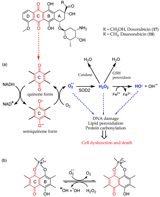 Redox cycling of anthracyclines 17 and 18, leading to ROS production and cardiotoxicity; it involves (a) the quinone C ring and (b) iron chelation (metal ion binding sites in B and C rings).