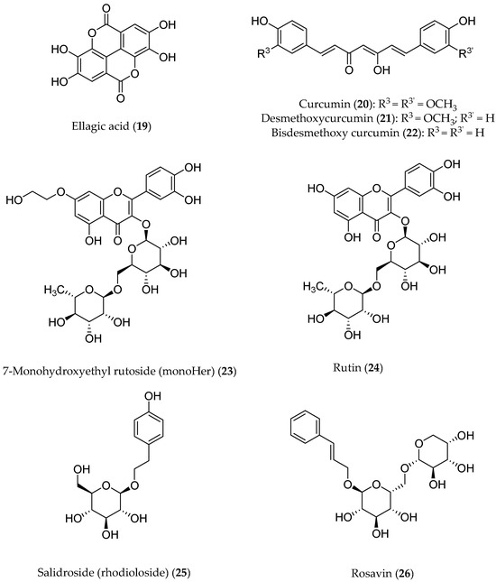 Ellagic acid (19, Figure 6) is a product of the hydrolysis of ellagitannins. Recent pharmacological studies have demonstrated that 19 acts as a free-radical scavenger, with several health benefits, such as anti-inflammatory, antihepatotoxic, antisteatosic, anticholestatic, antifibrogenic, antidiabetic, hypolipidemic, and antiatherosclerotic effects [76,77]. Moreover, ellagic acid has been proven to inhibit type-B monoamine oxidase (MAO-B) [78], thereby protecting rat brains from 6-hydroxydopamine-induced neuroinflammation in a model of Parkinson’s disease [79] and preventing scopolamine- and diazepam-induced cognitive impairments [80]. In male Wistar rats, orally administered 19 was proven to attenuate the doxorubicin-induced oxidative process in myocardial tissue [81].