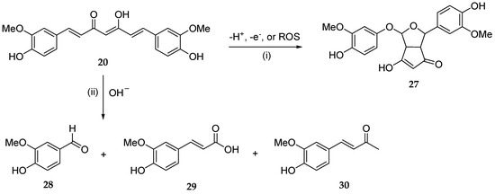 For example, numerous studies have proven that curcumin (20) is chemically and metabolically unstable and thereby poorly bioavailable [88]. A spectroscopic analysis revealed that a major degradation product (27) is formed by the autoxidation of 20 [100], whereas three minor degradation products, namely vanillin (28), ferulic acid (29), and the ketone product 30, are generated via a solvolysis reaction in an aqueous alkaline buffer [101] (Figure 7). Pharmaceutical nanotechnologies may implement efficient delivery systems aimed at improving the bioavailability of polyphenols [102].