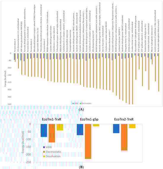 Van der Waals (VdW) and electrostatic (and desolvation in B) energy contributions to the binding energy for (A) each HsTrx2-protein complex and (B) for the complexes of EcoTrx1 and EcoTrx2 with TrxR and the gene 5 protein (g5p) as calculated by the HADDOCK web server.