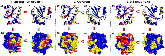 Thermal representation of the contact hot spots of HsTrx2 and their statistical distribution. Prioritized residues in the contact surfaces of HsTrx2 are shown for 1. Strong non-covalent interactions, 2. Covalent interactions, and 3. All interactions together with their percentage (%) in contacts with substrates. Contact hot spot residues (>3%) are colored in red, median hot spot residues (1–2%) in yellow, and non-hot spot residues (~≤1%) in blue. (A1–A3) Ribbon representation (hot spots labeled in red; Cys31 residue’s side chain is depicted with sticks’ representation and labeled in black). (B1–B3) Surface representation (hot spots labeled in white; Cys31 is labeled in black. (C1–C3) Ribbon representation of (A1–A3) rotated 180° with direction from right to left. (D1–D3) Surface representation of (B1–B3) rotated 180° with direction from right to left.