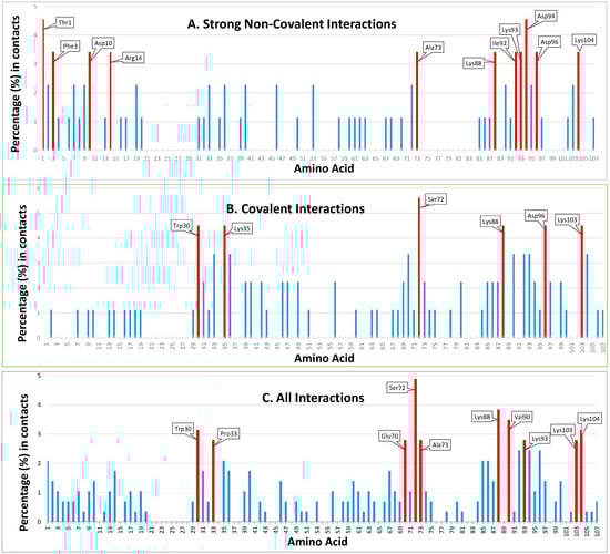 Fifty-one residues were seemingly involved in strong non-covalent interactions (acidic elutions). Thr1 and Asp94 were highest in preferences followed by Phe3, Asp10, Arg14, Ala73, Lys88, Ile92, Lys93, Asp96, and Lys104 (Figure 2(A1–D1) and Figure 3A). In total, 11/61 of involved residues (22%) appeared most prominent in strong non-covalent interactions. The distribution of non-covalent hot spots can be divided into two groups. One with somewhat diffused dispersion proximal to the active site (Lys93, Asp94, and Asp96) and another distal to the active site where residues are locally concentrated (Thr1, Phe3, Asp10, and Arg14). There is an overlap of the proximal non-covalent hot spots with those of the active site (“covalent” Lys103 with “non-covalent” Lys104). However, non-covalent hot spots of the distal site seem completely isolated from the covalent hot spots. Hot spots Lys88 and Asp96 were common for covalent and strong non-covalent interactions.