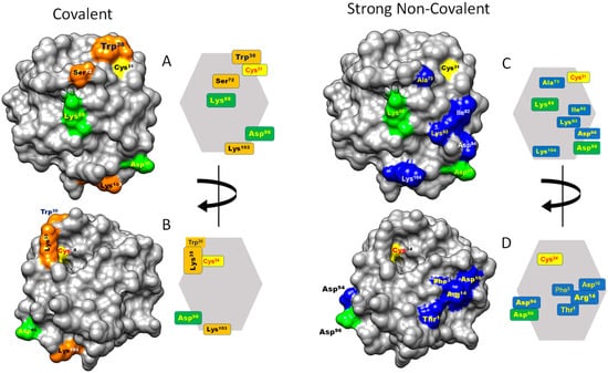The three-dimensional graphical representation of HsTrx2, including the identified satellite residues of the contact hot spots, proposed three major interacting areas with protein ligands (Figure 7): (i) an exposed corner area around the active site with preference for covalent interactions (thiol-disulfide interchange) (Figure 7A,C,E), (ii) a greater area in the one flat one side of the molecule adjacent to the active site for both covalent and non-covalent interactions (Figure 7B,D), and (iii) a third area on the opposite flat side, more amenable to non-covalent interactions (Figure 7A,C,F). These outcomes should be considered tentative preferences. All three areas are not exclusive to covalent or non-covalent interactions as testified by the presence of “exclusive covalent” or “exclusive strong non-covalent” binding residues in the immediate proximity of the described “strong non-covalent” and “covalent” binding areas, respectively. Moreover, if the selection threshold for contact residues is lowered, some covalent contact points will be found in the non-covalent binding area (Figure 4) and more non-covalent contacts in the only covalent one.