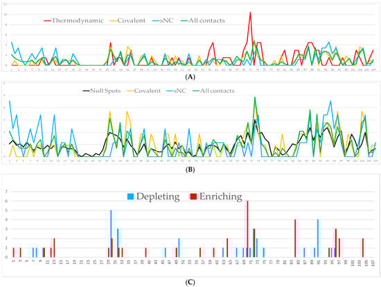 Only 5 residues (out of 107) were not considered null spots from the SpotOn online tool. All 57 covalent and 50 sNC contacts were considered putative null spots, with 37 residues being common for both categories. The 16 proposed thermodynamic hot spots that were common in covalent and sNC interactions were all included in the 37 common null spot residues. The percentage distribution of the null spots for HsTrx2 (Figure 5B) generally follows the distribution preference of the total contact hits, especially if a 0.25% threshold is subtracted from the percentage distribution of the null spots. Such a restriction is logical, given the proposition of the program for a high number of residues, some of them not accessible to solvent (e.g., 21–28). In summary, a comparison of the topological distribution of putative null spots and thermodynamic hot spots by SpotOn overlapped partially or completely with contact residues and contact hot spots (Figure 5A).
