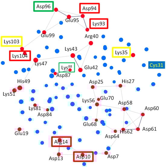 Three-dimensional Cα subnetworks of charged residues (all red circles) of HsTrx2. In red boxes are charged contact hot spot residues participating in strong non-covalent interactions. In yellow boxes are charged contact hot spots for covalent interactions, while in green are charged residue contact statistical hot spots participating in both covalent and strong non-covalent interactions. Subnetworks are presented as red circles connected with lines. All other residues are shown in blue. Subnetworks are presented as red circles connected with lines. Cys31 that is not participating in the subnetwork is also highlighted.