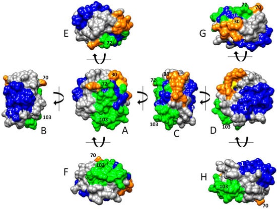 Surface areas of HsTrx2 involved in protein ligand recognition. In green are surfaces participating in covalent and strong non-covalent interactions, in orange are areas involved in covalent bonding, and in blue are regions involved in strong non-covalent interactions. The topology of interactions was calculated by combining (i) molecular docking that pinpointed contact hot spots and (ii) a network approach for the identification of the energy network neighbors of the contact hot spots. The structure of HsTrx2 is from PDB ID: 1w89, chain A, with all water molecules removed [35]. The orientations of shown molecules stem from (A) after vertical or horizontal turns of 90 degrees (B–H) in the direction of the arrows.