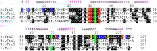 Alignment of HsTrx1 and EcoTrx1 and 2, relatively, to the three-dimensional structure of HsTrx2. At first, Trxs were aligned according to their primary sequence by Clustal Omega (https://www.ebi.ac.uk/Tools/msa/clustalo/, accessed on 1 May 2023). All residues identical to those of HsTrx2 were boxed on a black background. Then, each structure of the three Trxs was separately aligned to the three-dimensional structure of HsTrx2 (by the matchmaker function of UCSF Chimera). The resulting separate alignments of Trxs with HsTrx2 were put together. Residues in red, blue, and yellow backgrounds represent hot spot residues involved in covalent, strong non-covalent, and both covalent and strong non-covalent interactions, respectively. Residues in green background are additional hot spots identified by docking comparisons of all interacting partners (Figure 2(A3–D3) and Figure 3C). The secondary structure of HsTrx2 is shown above the alignment as derived from UniProt entry with ID Q99757. Pink letters correspond to residues non-accessible to solvent (as analyzed by BIOVIA Discovery Studio Visualizer-2021).