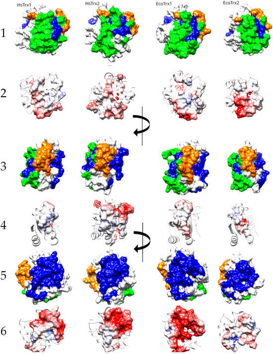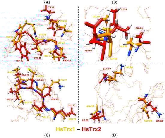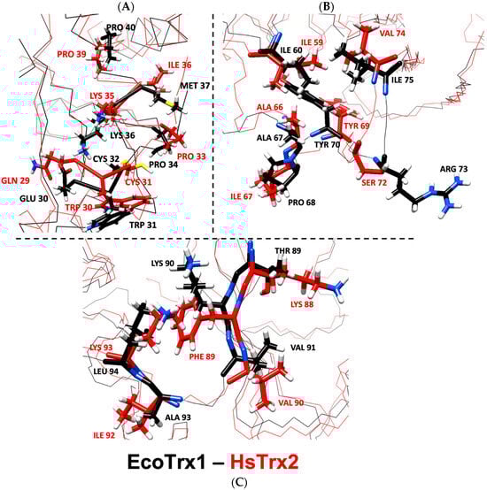 The specificity of Trxs, Grxs, and other enzymes is dictated by their interacting surfaces, itself formed by the need for interaction with respective ligands. A comparison of the primary sequence of HsTrx2 with HsTrx1, and EcoTrx1, 2 revealed (Figure 8) that apart from the area 20–36 that includes their active sites, the overall homology is limited. This becomes even more profound when the proteins are aligned according to their three-dimensional structures (Figure 8).