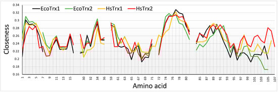 The model structure of the monothiol HsTrx2 was used as input in the NASP web server (https://bioinf.iiit.ac.in/NAPS/index.php, accessed on 1 September 2023) [49,50] for the identification of the centrality degree of the contact hot spots. The algorithm considers amino acid residues as nodes and connections between them as links/edges. The frameworks of links in the three-dimensional network of the nodes (Cαs of participating residues) are user-defined and may present information on networks and subnetworks of participating residues (Protein Contact Network). In our study, the distance of 7 Å was considered the threshold for link formation: if the Cα-Cα distance between two residues was less than 7 Å, an edge was drawn between the two nodes. The default value of 1 for residue separation of the protein’s backbone was used to capture short-range interactions.