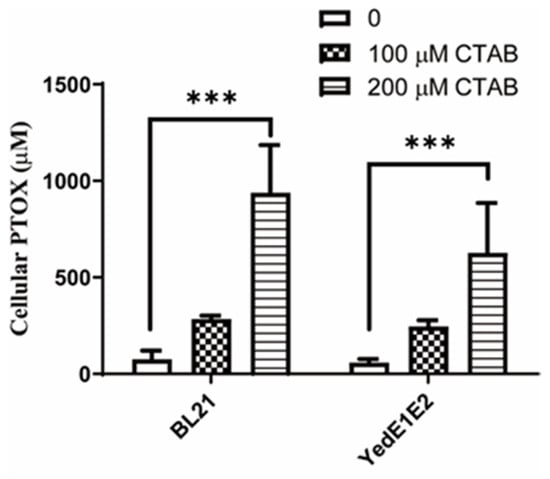The treatment of organic solvents or surfactants may increase membrane permeability and stimulate the transportation of substrates into microbial cells [,]. Cetyltrimethylammonium bromide (CTAB) is a cationic surfactant that increases cell membrane permeability. At low concentrations, it may increase substrate transportation, as it has been shown to promote the growth of biofilm []. At high concentrations, it is toxic []. Since CTAB displays tremendous inhibitory effects on osteosarcoma, its usage as a potential therapeutic drug is under exploration []. CTAB is also toxic to Escherichia coli, as its treatment of E. coli cells increases the production of superoxide and hydrogen peroxide []. Thus, CTAB may be used to improve the permeability of bacterial membranes for PTOX uptake when cell viability is maintained.