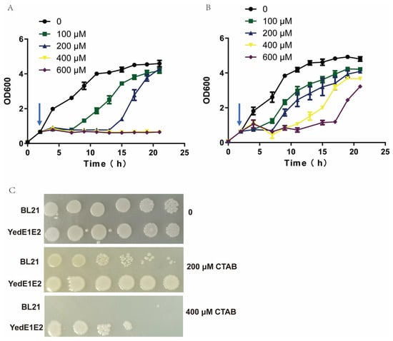 E. coli (YedE1E2) and E. coli BL21 in LB medium with 200 μM PTOX and varying concentrations of CTAB from 0 to 600 μM were cultivated. The growth and CTAB tolerance of each strain were detected. CTAB was more inhibitory to E. coli BL21 than to E. coli (YedE1E2) (Figure 2A,B). After 20 h cultivation, 600 μM CTAB completely inhibited the growth of E. coli BL21, and even 200 μM CTAB inhibited its growth for the first 10 h (Figure 2A). However, E. coli (YedE1E2) cells started to grow after 15 h in the presence of 600 μM CTAB (Figure 2B). When both E. coli BL21 and E. coli (YedE1E2) started to grow in the presence of CTAB, the growth rates were similar to those without CTAB (Figure 2A,B). The delayed growth is likely due to the toxicity of CTAB, and the late start of the growth could be due to the accumulation of mutations or the activation of resistant genes, which should be further investigated. On the agar plate, 400 μM CTAB was partially inhibitory to E. coli (YedE1E2) but completely inhibitory to E. coli BL21 (Figure 2C).