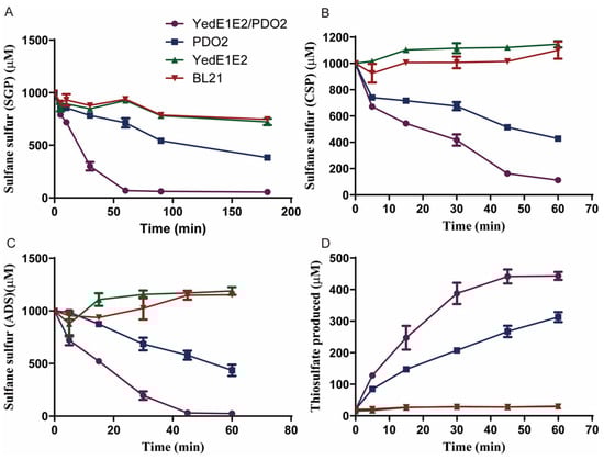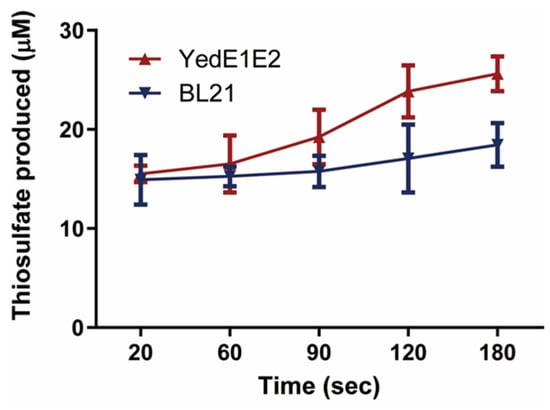 To detect whether YedE1E2 sped up the formation of GSSH, PDO was used to oxidize GSSH, which was formed between GSH and acetone-dissolved elemental sulfur. The reaction mixture also contained membrane fractions of E. coli (YedE1E2) or E. coli BL21. The reaction system containing the E. coli (YedE1E2) membrane fractions produced more thiosulfate than the system containing the E. coli BL21 membrane fractions (Figure 4). Sulfite was not detected in the first 3 min, as PDO oxidizes GSSH to GSH and sulfite, and the latter spontaneously reacts with excessive zero-valent sulfur to produce thiosulfate []. The results suggest that YedE1E2 facilitated the reaction of GSH and zero-valent sulfur to produce GSSH.