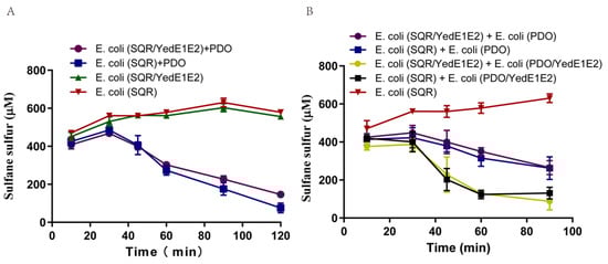 YedE1E2 stimulated the import but not the export of zero-valent sulfur. Cells were resuspended in 50 mM Tris-HCl buffer (pH 7.4) to OD600nm = 2. Intracellular zero-valent sulfur was produced from the oxidation of 1 mM sulfide by E. coli (SQR/YedE1E2) and E. coli (SQR). (A) The cells containing zero-valent sulfur were mixed with crude PDO; (B) the cells containing zero-valent sulfur were mixed with E. coli (PDO2) or E. coli (PDO2/YedE1E2). The E. coli stains contained three plasmids with the tested gene or gfp for comparison. Data are the averages of three measures with standard deviation.