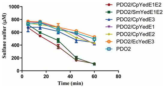 Preparation of crude PDO and its usage in zero-valent sulfur consumption. E. coli (PDO2) recombinant cells were cultivated and induced as above. Cells were harvested by centrifugation, resuspended in 50 mM Tris-HCl buffer (pH 7.4) to OD600nm of 5, and disrupted by a Pressure Cell Homogenizer (Stansted Fluid Power Ltd., Harlow, Essex, UK) at 4 °C. The lysate was centrifuged at 12,000× g for 10 min to remove cell debris. The supernatant containing soluble PDO2 and GSH was mixed with SQR and YedE1E2-expressing cells at OD600nm = 2, 1 mM sodium hydrogen sulfide (NaHS) was added to the suspension to initiate the sulfide oxidation by SQR and PDO2 at room temperature. The remaining sulfane sulfur in the suspension was analyzed using the KCN method as previously described [].