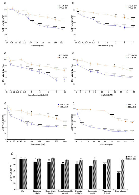 HTLA-ER cells acquired multidrug resistance. Cell viability was evaluated using MTS assay in HTLA-230 (blue lines) and in HTLA-ER cells (orange lines) treated with 0.625–125 µM etoposide (a), 0.025–5 µM doxorubicin (b), 0.05–10 mM cyclophosphamide (c), 0.165–33 µM cisplatin (d), 5–1000 µM carboplatin (e), and 1.25–250 nM vincristine (f) for 48 h. (g) reports the percentage viability of cells treated for 48 h with the clinically used doses of the compounds given alone or in a drug mixture (as in the induction therapy; last pair of columns) in comparison with that of untreated ones (100%). Histograms summarize quantitative data of means ± SEM of at least four independent experiments. * p < 0.1; ** p < 0.01; *** p < 0.001; and **** p < 0.0001 vs. untreated HTLA-230 or HTLA-ER cells.
