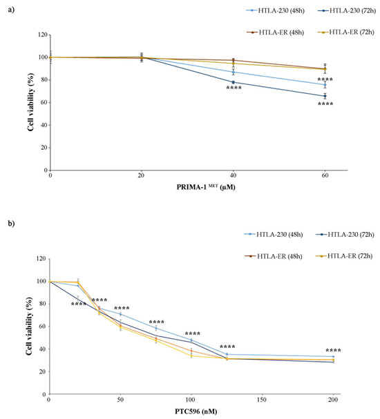 Selection of PRIMA-1MET and PTC596 dose treatments. Cell viability was evaluated using MTS assay in cells exposed to increasing concentrations of the drugs. (a) HTLA-230 and HTLA-ER cells were treated with 10–60 µM of PRIMA-1MET for 48 h and 72 h. (b) HTLA-ER cells were treated with 20–200 nM of PTC596 for 48 h and 72 h. Results are expressed as percentage variations in cell viability of treated cells with respect to that of untreated ones (100%). Graphs summarize quantitative data of means ± SEM of at least four independent experiments. **** p < 0.0001 vs. untreated HTLA-230 or HTLA-ER cells.