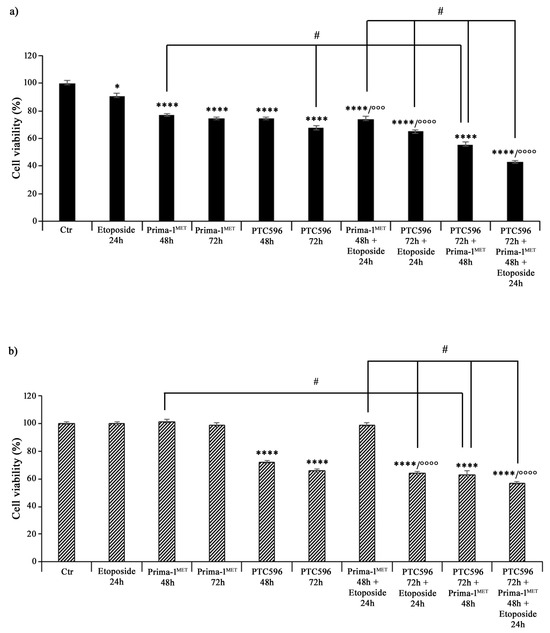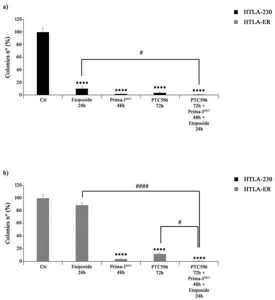 PRIMA-1MET and PTC596, used in combination, were cytotoxic to HTLA-230 and HTLA-ER cells. Cell viability was evaluated using MTS assay in HTLA-230 (a) and HTLA-ER (b) cells treated with 1.25 μM of etoposide (24 h), 60 μM of PRIMA-1MET (48 h and 72 h), and 35 nM of PTC596 (48 h and 72 h), given alone or in each possible combination. Results are expressed as percentage variations in cell viability of treated cells with respect to that of untreated ones (100%). Histograms summarize quantitative data of means ± SEM of at least four independent experiments. * p < 0.1; **** p < 0.0001 vs. untreated HTLA-230 or HTLA-ER cells (Ctr); °°° p < 0.001; °°°° p < 0.0001 vs. etoposide treated cells; # p < 0.0001 vs. respective treatments indicated by the bars.