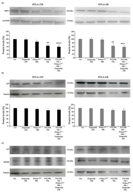 Therefore, taking into consideration all the results obtained, the subsequent experiments were performed by treating both NB cell populations with 1.25 μM of etoposide (24 h), 60 μM of PRIMA-1MET (48 h), and 35 nM of PTC596 (72 h) given alone or in combination (PTC596 + PRIMA-1MET + etoposide). The expression of the BMI-1 oncoprotein was also evaluated to quantify its levels under the described treatment conditions. As shown in Figure 4a, PTC596, given alone or in combination with PRIMA-1MET and etoposide, reduced the BMI-1 levels of the HTLA-230 and HTLA-ER cell populations by approximately 35% and by 40% compared with the control, respectively. Notably, the exposure to PRIMA-1MET or etoposide per se was not able to modify BMI-1 expression.