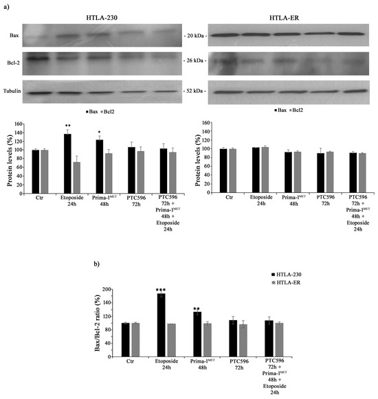 In fact, by calculating the Bax/Bcl-2 ratio, an increase of 80% and 35% was observed in HTLA-230 cells treated with etoposide and PRIMA-1MET, respectively, in comparison with untreated ones, confirming the induction of apoptosis in parental cells (Figure 5b).