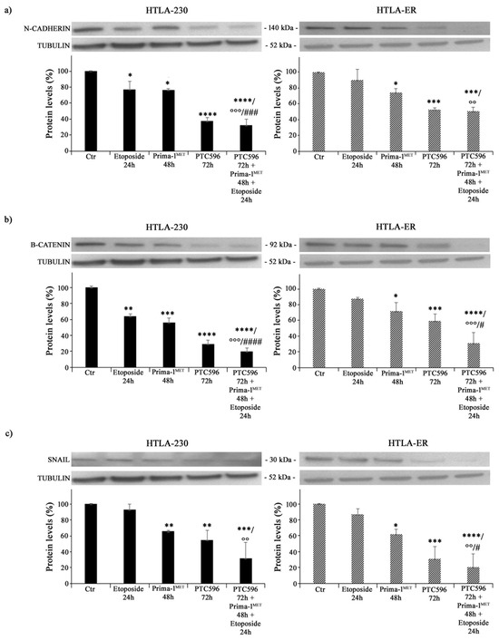 PRIMA-1MET and PTC596, alone or in combination, inhibit the expression of EMT-related proteins. Protein levels of N-cadherin (a), ß-catenin (b), and SNAIL (c) in HTLA-230 (left panels) and HTLA-ER (right panels) cells untreated or treated with 1.25 μM of etoposide (24 h), 60 μM of PRIMA-1MET (48 h), and 35 nM of PTC596 (72 h), given alone or in combination. Immunoblots shown are representative of four independent experiments. Tubulin is the internal loading control. Results are expressed as percentage variations in protein levels in treated cells with respect to that in untreated ones (100%). The histograms summarize quantitative data of protein level means, normalised to tubulin ± SEM of four independent experiments. * p < 0.1; ** p < 0.01; *** p < 0.001; **** p < 0.0001 vs. untreated cells (Ctr); °° p < 0.01; °°° p < 0.001 vs. etoposide-treated cells; # p < 0.1; ### p < 0.001; #### p < 0.0001 vs. PRIMA-1MET-treated cells.