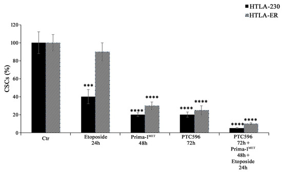 Considering that EMT has been well documented to have a strong overlap with the development of the CSC phenotype [61,62,63,64] and that EMT and CSCs have been demonstrated to be determining factors for the onset of chemoresistance [48,65], the ability to generate CSCs was also evaluated. As shown in Figure 8, PRIMA-1MET, PTC596 alone, and their combination with etoposide were able to inhibit CSC formation in HTLA-230 and HTLA-ER cells.