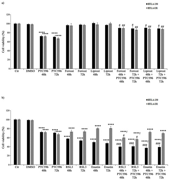 Based on the evidence that PTC596 alone and in combination with etoposide and PRIMA-1MET was more effective in inducing H2O2 overproduction, GSH depletion, lipid peroxidation, and non-apoptotic cell death, the hypothesis of the induction of ferroptosis, a newly described type of programmed cell death, was considered. Therefore, HTLA-230 and HTLA-ER were treated with ferrostatin or liprostatin, as ferroptosis-inhibitory agents, and with RSL3 or erastin, as ferroptosis-inducing compounds, for 48 h and 72 h, either given alone or co-administered with PTC596.