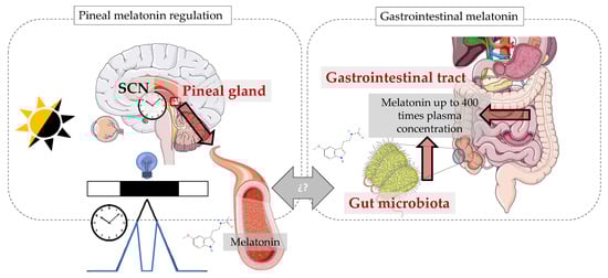 Pineal and gastrointestinal melatonin regulation. This figure was built with SMART resources (Servier Medical Art), licensed under a Creative Common Attribution 3.0 Generic License. See http://smart.servier.com/ (accessed on 1 September 2023).