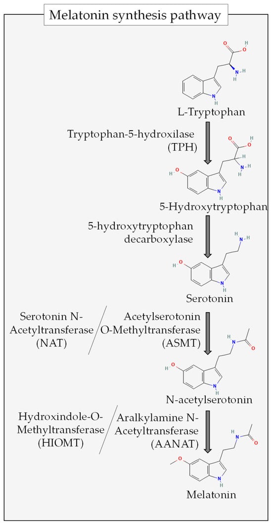 One approach to demonstrating the ability of the gut microbiota to produce melatonin has consisted of injecting a precursor of the indoleamine (5-Hydroxytryptophan, 5-HTP) into the gastrointestinal tract and evaluating whether melatonin increases at different levels (see Figure 2 for melatonin synthesis pathway). Pan et al. (2021) identified the highest concentrations of the hormone in the colon, which suggested that the microbiota present at that level of the gastrointestinal tract may participate in melatonin production. These authors also demonstrated that melatonin produced in the gut can also reach the bloodstream via the portal vein, since sheep injected with 5-HTP also exhibited higher plasma melatonin concentrations []. However, considering that the possible interplay between melatonin from pineal and extrapineal sources has not yet been elucidated, this statement might be considered questionable.