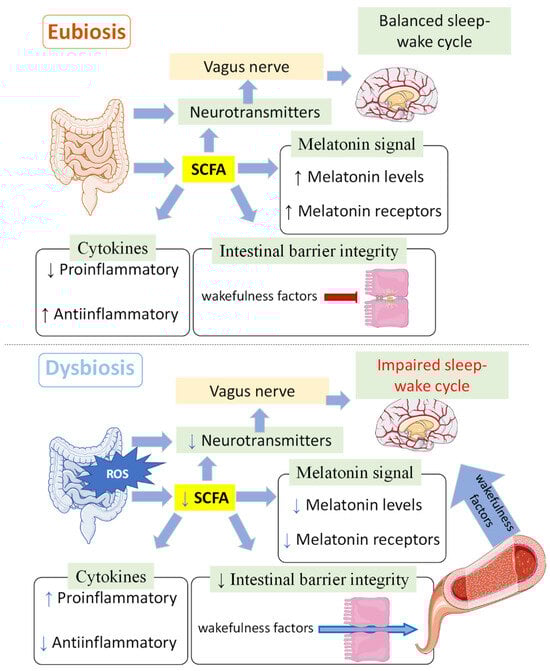 On the other hand, healthy microbiota will maintain the production of neurotransmitters, both directly and indirectly, through SCFA production, which will activate enterochromaffin cells, which in turn secrete different neurotransmitters []. However, most neurotransmitters cannot pass the intestinal and the blood–brain barriers [], so those molecules produced in the intestine will act through the vagus nerve, which contains receptors and can send the signal to the brain []. The melatonin signal will also be enhanced not only by direct melatonin production but also through the upregulation of its receptors mediated by SCFAs []. SCFAs are also immunomodulators that reduce proinflammatory cytokines and increase anti-inflammatory cytokines [,,,], which, together with the better union between epithelial cells [,,], will prevent different wakefulness factors from being included in systemic circulation. When the gut microbiota composition/homeostasis is disrupted (dysbiosis), the reduction in SCFAs, together with the increase in lipopolysaccharides, will produce an increase in proinflammatory cytokines and will make both the blood–brain barrier and the intestinal barrier more permeable, favouring the passage of these molecules to systemic circulation [], activating the hypothalamic–pituitary–adrenal axis and producing wakefulness neurotransmitters/hormones (e.g., norepinephrine, cortisol) [,,].