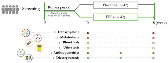 Study design summary: After a 2-week run-in period, adults with a low fruit and vegetable intake were randomly assigned to receive either a placebo or the PBS for 8 weeks. Blood and urine samples were collected while fasting at the beginning and end of the study to evaluate clinical and multi-omics biomarkers. PBS, a plant-based vitamin/mineral supplement.