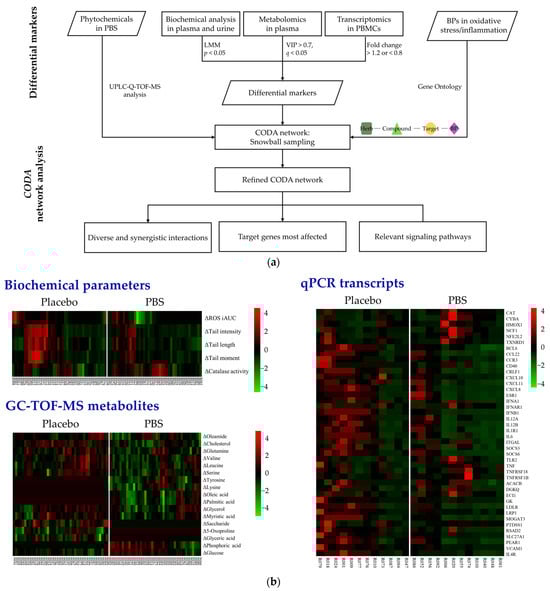 Integration and analysis of clinical and multi-omics data through CODA network analysis: (a) Comprehensive workflow. (b) Heatmaps indicate significant changes after 8 weeks of PBS supplementation. A color gradient was used, where red represents increased levels, green denotes reduced levels, and black indicates no significant change. PBS, a plant-based vitamin/mineral supplement; BP, biological process; LMM, linear mixed-effects model; VIP, variable importance in projection; PBMC, peripheral blood mononuclear cell; CODA, context-oriented directed association; GC-TOF-MS, gas chromatography–time-of-flight mass spectrometry; qPCR, quantitative polymerase chain reaction.