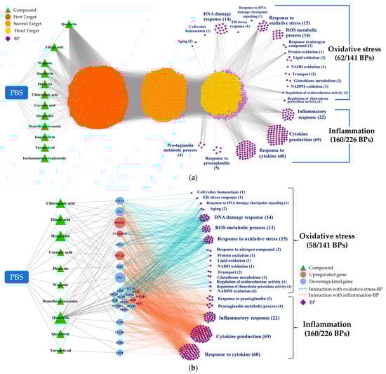 CODA network visualization for the complex interplay of components within the study: (a) A four-layered network, delineating possible linkages between PBS phytochemicals, their targets, and BPs, as inferred through snowball sampling methodology. (b) A streamlined network, emphasizing targets directly linked to altered omics markers. CODA, context-oriented directed association; PBS, a plant-based vitamin/mineral supplement; BP, biological process; ER, endoplasmic reticulum; NADH, nicotinamide adenine dinucleotide + hydrogen; NADPH, nicotinamide adenine dinucleotide phosphate + hydrogen.