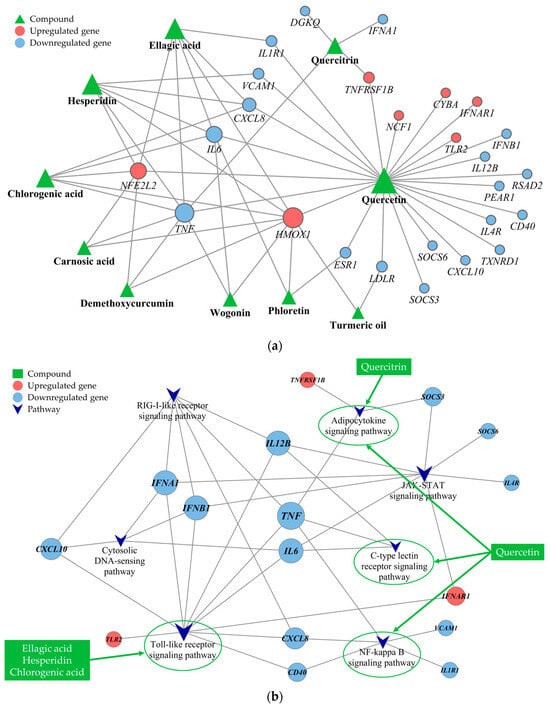 Several PBS phytochemicals demonstrated interactions with a multitude of targets, shedding light on their extensive range of effects. Figure 4a shows that quercetin interacted with the highest number of targets (degree = 24), followed by ellagic acid and hesperidin (degree = 6), chlorogenic acid (degree = 5), and quercitrin (degree = 4). Additionally, certain targets were linked to more than two phytochemicals, indicating possible synergistic effects when the phytochemicals engaged with specific genes. Genes associated with antioxidative functions, such as HMOX1 (degree = 9) and NFE2L2 (degree = 6), were upregulated and had numerous connections to phytochemicals. Conversely, genes such as TNF (degree = 8), IL-6 and CXCL8 (degree = 4), and ESR1, IL1R1, LDLR, TNFRSF1B, and VCAM1 (degree = 2) were found to be downregulated.