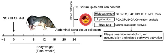 Ten male Wuzhishan miniature pigs aged 6–7 months were acquired from the Institute of Animal Sciences, Hainan Academy of Agricultural Sciences (Haikou, China), in this study. Each pig was individually housed and had a 12 h light and dark cycle. Before the experiment, the pigs were fed a regular diet and had free access to water. After 4 weeks of acclimatization, the animals were divided into two groups and fed either an NC (3.2 kcal·g−1, 22% of kcal from protein, 8% of kcal from fat, and 70% of kcal from carbohydrate) or an HFCF (4.5 kcal·g−1, 12% of kcal from protein, 46% from fat, and 42% from carbohydrate) diet for 6 months. Each group consisted of five animals. The HFCF diet consisted of 15% shortening oil, 10% egg yolk power, 1.5% cholesterol, 10% fructose, and 63.5% normal chow diet. The pigs in each group were fed twice daily with a total daily amount equivalent to 2.5% of their body weight. The Laboratory Animal Management and Use Committee of the Zhejiang Chinese Medical University (Hangzhou, China, permit no. ZSLL-2016-0013) authorized all procedures for this study. A diagram of the animal experiment is shown in Figure 1.