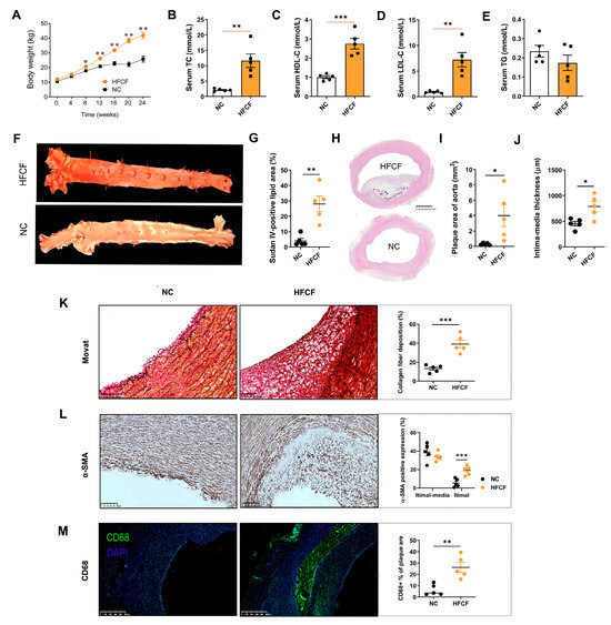 Pigs on the HFCF diet exhibited significant weight gain (29.9 ± 5.1 kg vs. 14.2 ± 4.8 kg) and higher serum cholesterol levels, including TC (p < 0.01) and LDL-C (p < 0.01), compared with the pigs in the normal chow group (Figure 2A,B,D). No significant differences in TG concentrations were observed between the HFCF and NC groups. Sudan IV staining revealed a substantial increase in atherosclerotic lesion areas in HFCF-fed pigs (Figure 2F,G). Histological examination of H&E sections showed that the intimal area and intima-media thickness of aortas in the HFCF group were 13.0- and 1.5-fold higher than those in the NC group (p < 0.05) (Figure 2H–J). Distinctive features of atherosclerosis, including foam cell infiltration, necrotic core formation, and smooth muscle cell proliferation, were observed in arterial tissues of the HFCF group (Figure 2H). Sections were stained with Movat pentachrome to assess intimal and medial areas and plaque classification, while α-SMA staining confirmed collagen deposition and smooth muscle cell migration (Figure 2K,L). Moreover, increased CD68-positive staining was observed in the aorta of the HFCF group (p < 0.01) (Figure 2M).