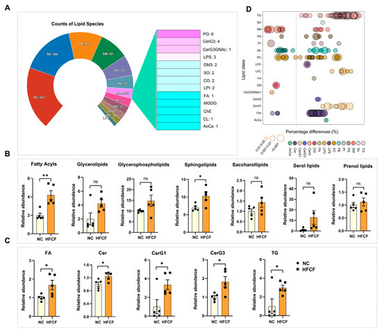 Changes in the overall lipid composition and distribution in the aorta of atherosclerotic pigs fed a high-fat, high-cholesterol, and high-fructose diet. (A) Distribution of lipid classes considered for subsequent analysis in all of the samples detected via LC-MS/MS; (B) the intensity fold change in fatty acyls, glycerolipids, glycerophospholipids, sphingolipids, saccharolipids, and prenol lipids; (C) the intensity fold change in AcCa, FA, Cer, CerG1, CerG3, and TG; only lipids with p < 0.05 are displayed; and (D) bubble plot of altered lipid species in the aorta of atherosclerotic pigs fed a HFCF diet. Each dot represents a lipid species, and the dot size indicates significance. NC, normal chow; HFCF, high-fat, high-cholesterol, and high-fructose diet; ns, no significant. All data were assessed using Student’s t-test and are presented as mean ± SEM, n = 5 per group. * p < 0.05, ** p < 0.01.