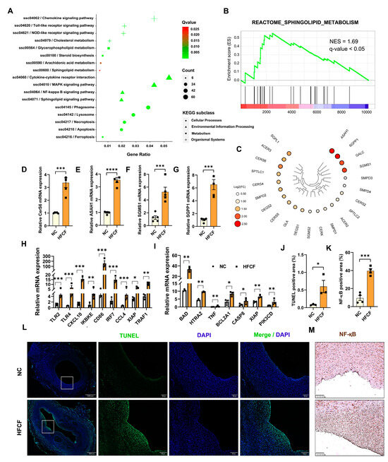 Alterations in the aortic transcriptional profiles of atherosclerotic pigs fed a high-fat, high-cholesterol, and high-fructose diet. (A) KEGG pathway analysis showing the enrichment of functional categories. The size of shapes indicates gene counts. The dot color indicates significance, and corresponding significance values are displayed as log10 (p-value). (B) Gene set enrichment analysis showing significant enrichment in sphingolipid metabolism. (C) Heatmap showing the ceramide-generation-related genes. The greater the log2 (fold change), the higher the significance. (D–G) qRT-PCR analysis of CERS6, ASAH1, SGMS1, and SGPP1 (n = 5). (H) relative expression levels of selected genes involved in the NF-қB signaling pathway from the RNA-Seq dataset; (I) relative expression levels of selected genes involved in apoptosis from the RNA-Seq dataset. (J) The quantification of TUNEL-positive cells (n = 3). (K) The quantification of NF-қB-positive cells (n = 4). (L) Representative photographs of TUNEL-stained aorta of the NC and HFCF groups of pigs. Green, TUNEL; blue, DAPI. Scale bars, 200 and 1000 μm. (M) Representative photomicrographs of NF-қB staining in sections of the abdominal aorta in the NC and HFCF groups of pigs. Scale bars, 100 μm. NC, normal chow; HFCF, high-fat, high-cholesterol, and high-fructose diet. All data were assessed using Student’s t-test and are presented as mean ± SEM. * p < 0.05, ** p < 0.01, *** p < 0.001, **** p < 0.0001.
