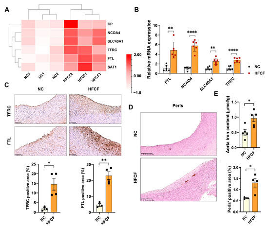 Prior studies have highlighted iron accumulation in human atherosclerotic plaque areas and its close relationship to atherosclerosis [16]. GO, KEGG, and GSEA analyses revealed dysregulation of the expression of iron absorption and transport genes in the abdominal aorta of the HFCF group of pigs. Notably, we observed a significant increase in the expression of transferrin receptor (TFRC), which is primarily responsible for iron uptake, and iron transporter (SLC40A1), which is primarily responsible for iron export, in the abdominal aorta of the HFCF group. Other genes involved in iron homeostasis, such as ferritin light chain (FTL) and nuclear receptor coactivator 4 (NCOA4), were also significantly upregulated following the HFCF diet (Figure 6A). We corroborated the RNA-Seq results via qRT-PCR, demonstrating that TFRC (p < 0.0001), SLC40A1 (p < 0.0001), NCOA4 (p < 0.01), and FTL (p < 0.01) were upregulated in the HFCF group (Figure 6B). Immunohistochemistry results indicated that TFRC and FTL protein expression significantly increased (Figure 6C). Moreover, a significantly higher iron content was found in the abdominal aorta of the HFCF group compared with the NC group, corroborated by Perls’ iron staining (Figure 6D, E). Taken together, these results suggest that HFCF diet feeding leads to iron overload due to the dysregulation of iron metabolism in the abdominal aorta of pigs.