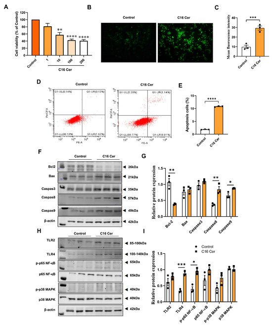 C16 ceramide induces oxidative stress, apoptosis, and inflammatory response in macrophages. (A) Cell viability of RAW264.7 cells treated with 1–200 μM of C16 Cer for 24 h (n = 6); (B) ROS generation with C16 Cer treatment was analyzed via 2′,7′-dichlorodihydro-fluorescein diacetate (DCFH-DA) staining; (C) the quantification of ROS levels in RAW264.7 cells (n = 3); (D) the apoptosis of RAW264.7 cells after C16 Cer treatment was assessed via flow cytometric analysis; (E) the relative levels of apoptosis in RAW264.7 cells (n = 3); (F) immunoblot analysis of Bcl2, Bax, Caspase-3, Caspase-8, and Caspase-9 in RAW264.7 cells; (G) the normalized band intensities of Bcl2, Bax, Caspase-3, Caspase-8, and Caspase-9 compared with β-actin (n = 3); (H) immunoblot analysis of TLR2, TLR4, p-p65 NF-қB, p65 NF-қB, p-p38 MAPK, and p38 MAPK; (I) the normalized band intensities of TLR2, TLR4, p-p65 NF-қB, p65 NF-қB, p-p38 MAPK, and p38 MAPK compared with β-actin (n = 3). C16 Cer, C16 ceramide. All data were assessed using Student’s t-test and are presented as mean ± SEM. * p < 0.05, ** p < 0.01, *** p < 0.001, **** p < 0.0001.