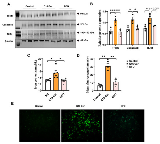To confirm the role of iron in C16 ceramide-induced oxidative stress, apoptosis, and inflammation in macrophages, we pretreated RAW264.7 cells with 50 μM of DFO. The results showed that the C16 Cer treatment significantly increased intracellular iron content (p < 0.05) and upregulated the protein expression levels of TFRC (p < 0.001) in RAW264.7 cells (Figure 8A–C). Pretreatment with DFO mitigated the increase in TFRC (p < 0.01), intracellular iron content (p < 0.05), and ROS levels (p < 0.01) induced by C16 Cer treatment (Figure 8A–E). Additionally, DFO pretreatment ameliorated the increased protein expression levels of TLR4 (p = 0.051) and Caspase-8 (p < 0.05) induced by C16 Cer treatment (Figure 8A,B).